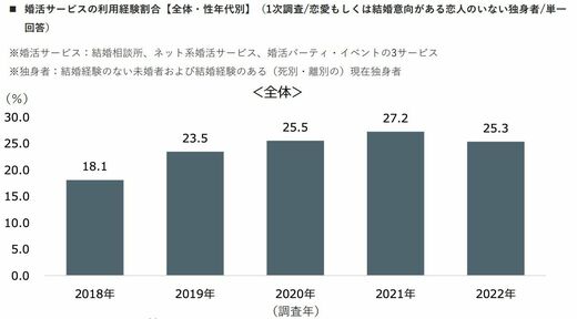 次に、独身者における婚活サービスの利用状況を見ていく。2022年の調査では、恋愛もしくは結婚の意向があり、恋人がいない独身者のうち、約4人に1人(25.3%)が婚活サービスを利用したことがあるとわかった。