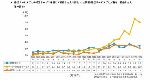 とくに、サービスごとに見ていくと、「ネット系婚活サービス」を通じて結婚した人の割合は、2016年が4.5%だったのに対し、2021年は10%とここ数年で急激に伸びている。