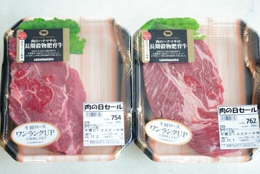 「肩ロース」は肩から背中にかけての頭に近い部分。左側の肉は牛肩ロースといっても首(ネック)寄りの部位なので、焼くと硬くなります。ステーキにするのであれば、どちらかというとリブロース寄りの右側の牛肉を選ぶのが正解です。