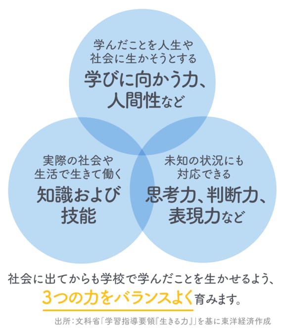 新しい学力観というのは、新学習指導要領で明記されている下図の3つの力で、知識・技能だけでなく、思考力・判断力・表現力。さらに、学んだことを社会にどう生かしてくのかという学びに向かう姿勢までを含めます。