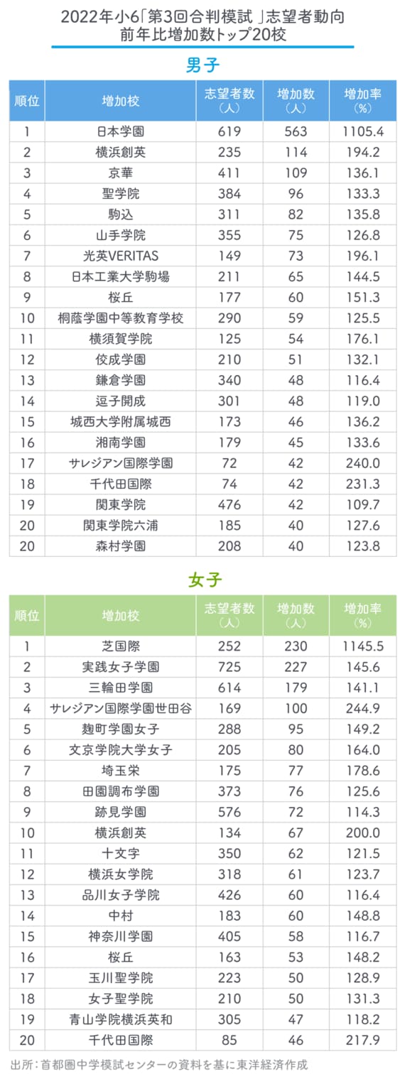 志望者が増加しているトップ20校を見てみると、男子の1位に挙がっている日本学園は、明治時代に創立された長い歴史を持つ男子校ですが、明治大学の系列校になって共学化することで注目が集まっています。2位の横浜創英は、元麹町中学校の工藤勇一氏が校長に就任し、「自分で考えて行動できる人の育成」をキーワードに教えない教育へシフトした結果、わずか2年で「県立高校の併願校」という位置づけから、半数が第1志望で入学する高校になり、中学も人気が出ています。
