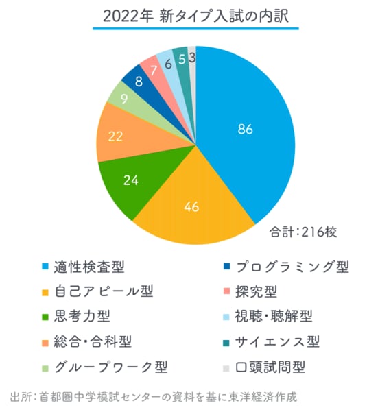 こうした動きを先取りして、首都圏の私立中学の入試では、多様化が広がってきています。私立の中学入試は、算数・国語の2科目か、理科・社会を加えた4科目入試が主流ですが、2022年には、公立中高一貫校との併願を視野に入れた適性検査型入試、自己アピール型入試、グループワーク型入試など、新タイプ入試といわれるさまざまな入試を実施する学校が150校に上り、受験者数も1万7047人と6年間で倍増しています。また小学校での英語の教科化に伴って、英語入試を行う学校も増えています。