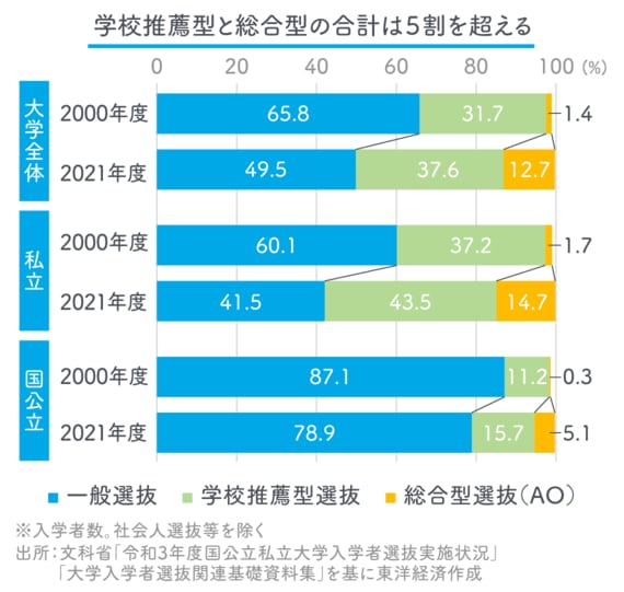 文部科学省の大学入学者選抜に関する資料によれば、従来型の一般入試の枠が減ってきています。国公立大学でもこうした入試枠を今後3割まで増やそうとしています。