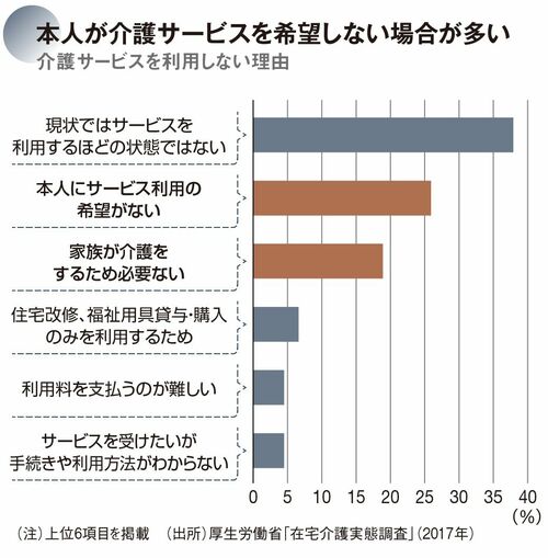 2017年に厚労省が実施した在宅介護実態調査の集計結果によれば、介護サービスを利用しない理由の最多は「現状ではサービスを利用するほどの状態ではない」で37.9%。3番目に多かったのが「家族が介護をするため必要ない」(18.9%)だった。悟さんの母親はこれに当たる。