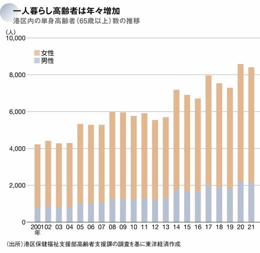2001年に4000人ほどだった港区の一人暮らし高齢者の数は2020年には倍の8000人を超えた。自覚なく認知症が進んでいたり、今回の女性のように日常生活がままならなくなっているにもかかわらず行政の支援を拒もうとする高齢者も少なくない。