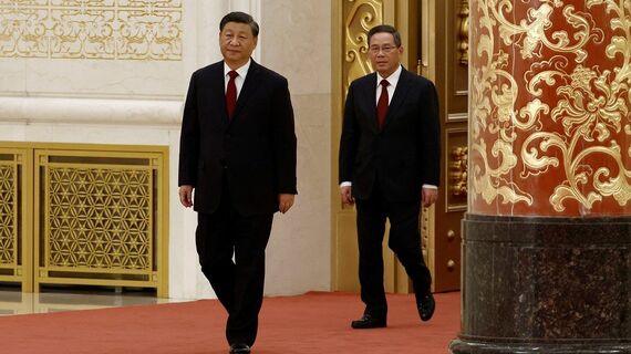中国共産党の新たな最高指導部のお披露目式で、李強氏は習近平国家主席に続くナンバー2として表舞台に現れた(写真:ロイター/アフロ)