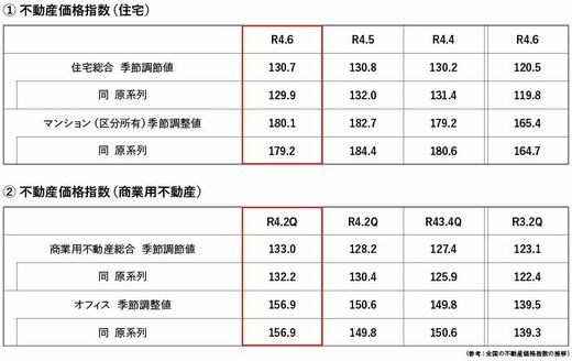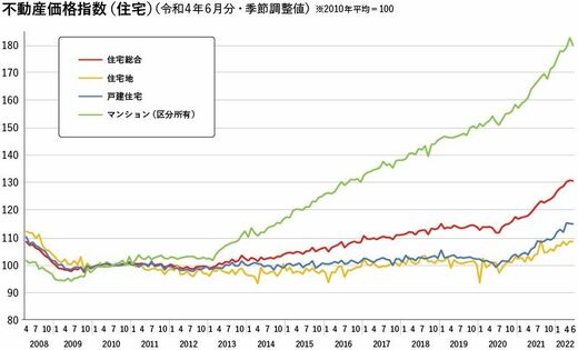 国土交通省は、年間約30万件の不動産の取引価格情報をもとに、全国・ブロック別・都市圏別に不動産価格の動向を指数化した「不動産価格指数」を毎月公表しています。2022年6月分と1年前の2021年6月分と比較すると10ポイントも上昇しており、不動産価格の上昇傾向が続いていることがわかります。