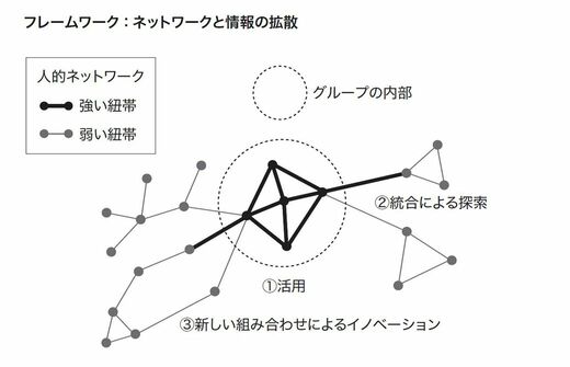 メンバーは互いのことをよく知っていて、信頼し合っているので、暗黙知を共有し合う可能性が高い。しかし、強い紐帯で結びついた人的ネットワークは、暗黙知を表面に引き出すことに長けている半面、新しいアイデアを生み出すことには長けていない。
