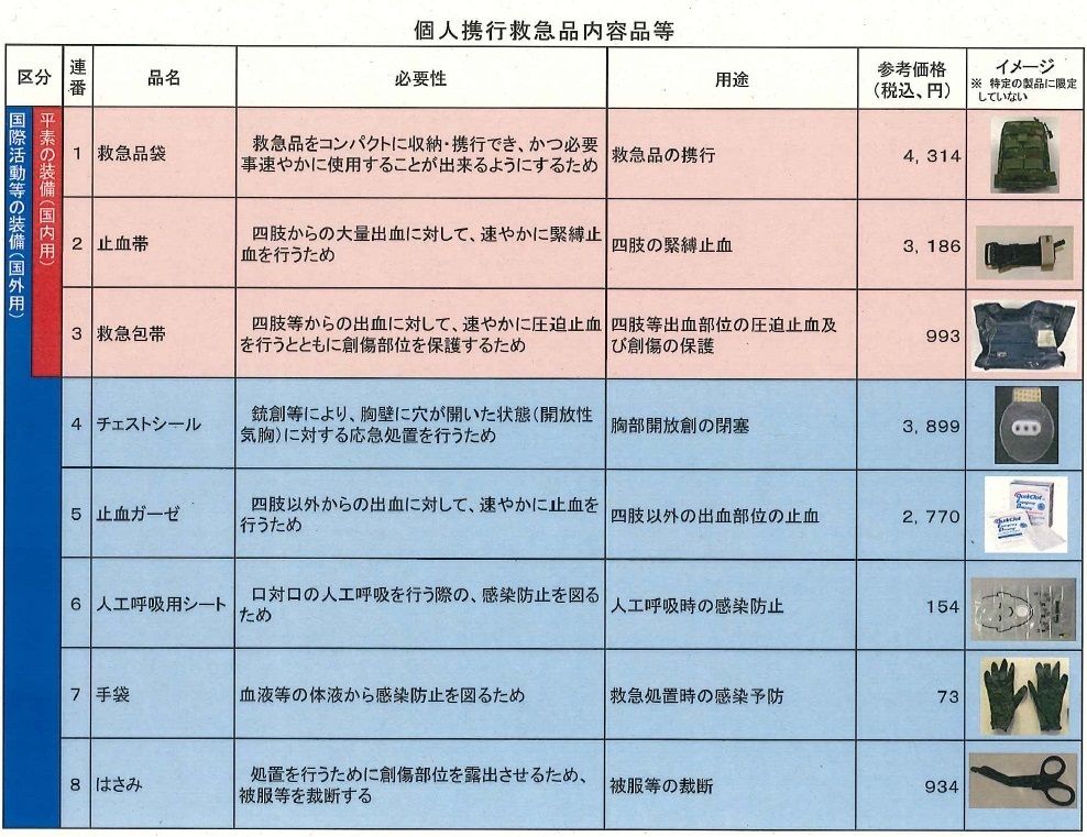 2013年、筆者の取材とそれに基づく当時の君塚陸幕長に対する質問から、「個人携行救急品」にはPKOなどを想定した国際用(国外用)と通常用(国内用)との二種類が存在することが分かった。以下にその構成品を紹介する。