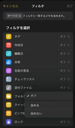 次に、「スマートフォルダに変換」をタップする。フィルタを選択する。ここでは、「ロック」という項目を選び、「含める」に変更した。あとは画面右上の完了をタップすると、ロックがかかったメモだけだけを集めたフォルダが自動的に出来上がる。