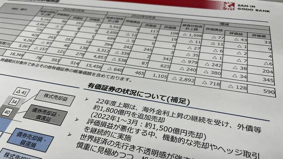 含み損の額がもっとも大きかったのは、640億円の山陰合同銀行。外債などの外国証券で339億円、外債ファンドなどで538億円の含み損を計上した。株式の含み益が242億円あったが、打ち消せなかった。
