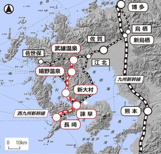 西九州新幹線は1973年の整備計画決定時、「九州新幹線(長崎ルート)」の名で呼ばれていた。いわゆる整備新幹線5路線の中では異色の存在だ。未開業の新鳥栖―武雄温泉間を含めても、東北新幹線・盛岡以北の3分の2、九州新幹線の5分の2にすぎない。盛岡以北と同様、政令指定都市には直結していないが、枝線状に分岐している点では盛岡以北と異なる。何より、「全線フル規格」での整備を必ずしも想定せずに工事が進んできた経緯が特徴的だ。