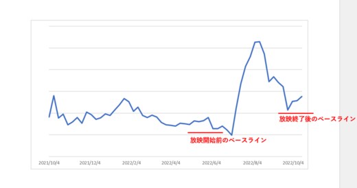 ここで着目したいのは、テレビCMの放映が終了したあとも検索量が下がり切らず、ベースラインの水準がCM放映開始前より上がっている点。CM放映後も一定の検索量が維持されているのは、CM放映によって瞬間的な注目を集めただけでなく、中長期的なブランド認知に成功したからだと考えられる。
