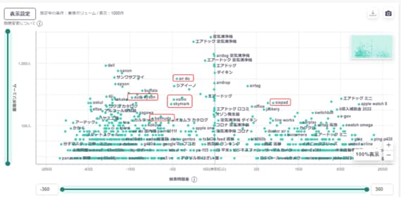 そこで、検索者が「Airdog」を検索した前後に検索していたワードを調べてみると、「AIRDO」「SKYMARK」といった航空会社の名前のほか、「Volvo」「Audi」といった自動車メーカーの名前が多く見られた。