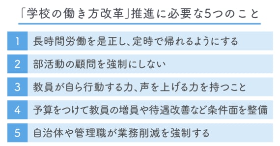 ――教員不足や教職志望者の減少が問題になっています。その解決に必要な学校の働き方改革を推進するには何が必要でしょうか。