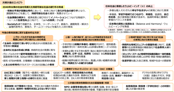 現在、文部科学省、中央教育審議会では教育振興基本計画という国の教育政策の根幹となる次期計画を検討しているが、直近の素案では、子どもたちと社会のウェルビーイングがキーコンセプトになっている。