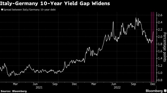 イタリア10年国債のドイツ債に対する上乗せ利回りは先週、ECBの決定を受けて214ベーシスポイント(bp、1bp=0.01%)に拡大し、11月初旬以来の高水準となった。