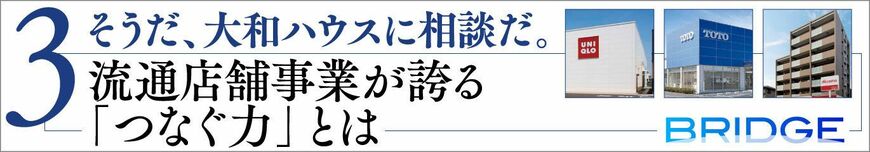 現在、大和ハウス工業がリレーションを持つ土地オーナーは、実に約4万人。テナントとして継続的に出店している企業は約4000社に及ぶ。現在では当たり前ともなっている商業施設が建ち並ぶロードサイドの風景は、大和ハウス工業がその多くを担っていると言っても過言ではないだろう。