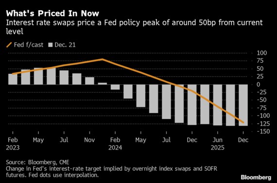 だが米連邦公開市場委員会(FOMC)の政策発表日とリンクしたオーバーナイト・インデックス・スワップ(OIS)は来年5月の会合までに0.5ポイント超の利上げしか織り込んでいない。その後、23年末までに0.5ポイントの利下げを想定している。