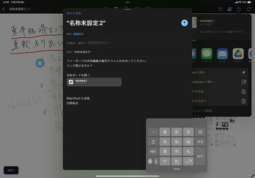共有が終わると、共有ボタンの隣の人型のアイコンが有効になる。ここでは、改めて権限を変更したり、共同で編集している人と連絡を取り合うことができる。連絡方法はメッセージアプリやFaceTime。FaceTimeでビデオ通話をしながら、フリーボードを編集することも可能だ。お互いの顔を見ながら、1つのフリーボードに手書きしていくのは、まさに会議室のホワイトボード。フリーボードがリモートワークでのオンライン会議にうってつけのツールといえるのは、そのためだ。