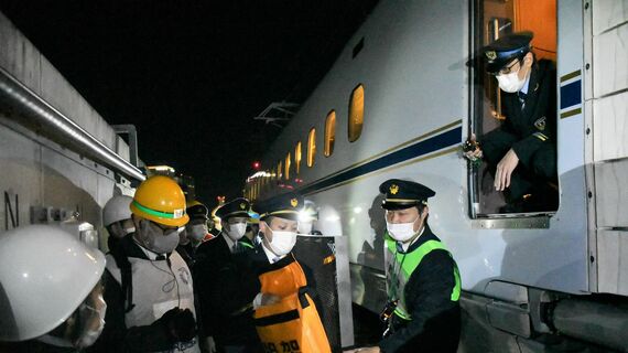新幹線の運行が終了した深夜。温度計の目盛りは気温3.6度を指していた。厳寒の12月14日の深夜から翌日未明にかけ、大規模地震を想定した東海道・山陽新幹線の訓練をJR東海とJR西日本が合同で実施。両社の社員約100人が参加した。