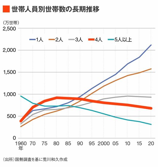 かつて「夫婦とこどもふたり」の4人家族が標準世帯と呼ばれた時代がありました。事実、長期の世帯構成人数推移を見ると、1970年代から1980年代までは「4人世帯」が世帯の中でもっとも多い構成比を占めていました。