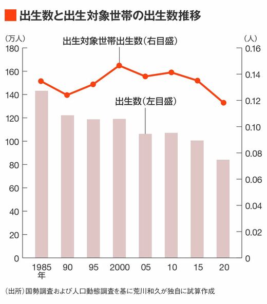 1985年の出生数は143万人、2020年は84万人なので出生数も約41%減になっていますが、49歳までの夫婦と子世帯を分母とした「出生対象世帯あたり出生数」を計算すると、1985年から2020年にかけてほぼ変わりなく推移しています。