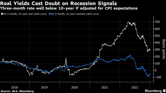 ハーベイ氏のモデルはインフレ調整後の利回りにリンクしており、インフレ期待が逆転状態にあって、トレーダーが先行きの物価圧力の緩和を見込んでいるという事実も、将来的なリセッションの確率を低下させる要因となっている。