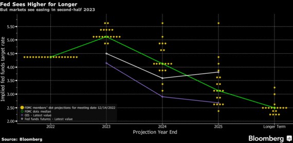 米金融当局者は先月の連邦公開市場委員会(FOMC)会合でフェデラルファンド(FF)金利の誘導目標レンジを4.25-4.5%に引き上げるとともに、最新の四半期経済予測では23年末時点のFF金利見通しを5.1%に上方修正した。