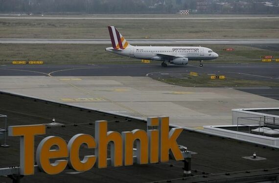 3月26日、マルセイユ検察当局は、ドイツ機墜落事故で副操縦士が故意に墜落させた可能性を指摘した。写真はジャーマンウィングスの旅客機。デュッセルドルフ空港で25日撮影(2015年 ロイター/Wolfgang Rattay)