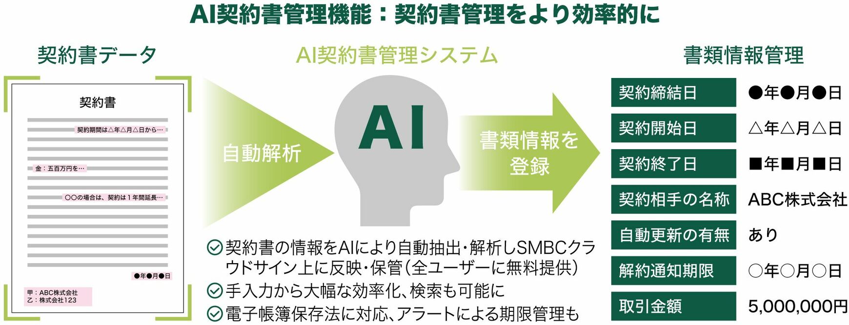 「AI契約書管理」は、締結した契約書をAIが自動で読み取り、契約日や契約金額などのデータをSMBCクラウドサイン上に自動で登録する機能だ。22年7月のリリース以降、足元では2000社超の企業に導入され、契約書管理サービスではすでに国内トップクラスのシェアとなっている。さらに22年12月には解析可能な契約書の種類も大幅に拡大し、幅広いビジネスシーンにおいて本機能を活用することが可能となった。