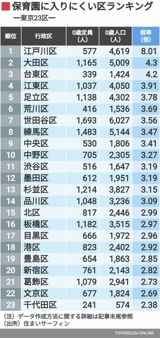 また、このランキングでワースト5に入った大田区・台東区・江東区・足立区は2022年に「待機児童人数1桁」となっており、行政発表のイメージとはかなり異なることがわかる。