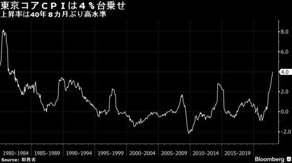 全国の物価の先行指標となる東京都区部の消費者物価指数(生鮮食品を除くコアCPI)は、昨年12月に前年同月比4.0%上昇と、1982年4月(4.2%上昇)以来、40年8カ月ぶりに4%台に乗った。原材料高や円安を背景に価格転嫁が続く食料品に加え、エネルギーが全体を押し上げた。総務省が10日に発表した。