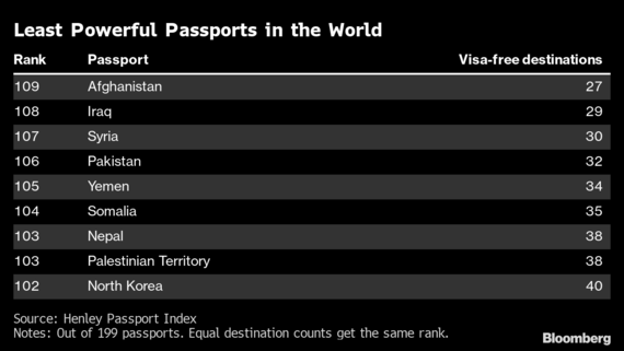 ロンドンのコンサルティング会社ヘンリー・アンド・パートナーズが、国際航空運送協会 (IATA)のデータを用いて199カ国・地域が発給したパスポートの227都市へのアクセスについてランク付けした。