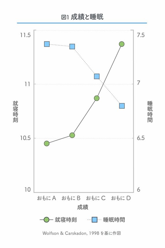図1は成績と睡眠の関係を表したもので、米国の中・高校生(13~19歳)を対象としたものです。成績が悪くなるほど就寝時刻は後退し、睡眠時間は短縮しています。睡眠時間の後退は、成績だけではなく精神状態にも悪影響を与えます。