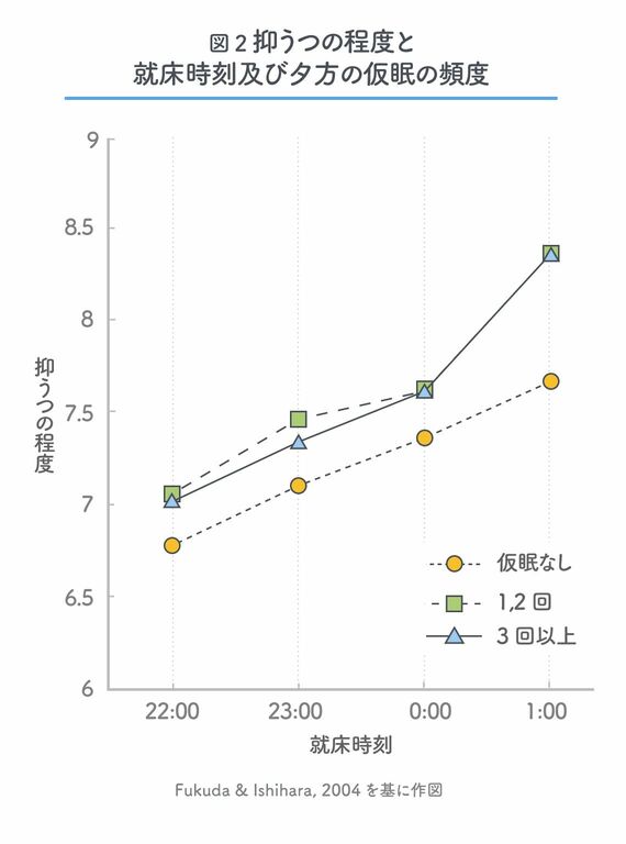 図2は、約5000名の日本の中学生を対象にした結果ですが、夜更かしであればあるほど抑うつレベルは高くなります。また、同じ時刻に眠っていても夕方に仮眠をとっているほど抑うつレベルが高くなっています。