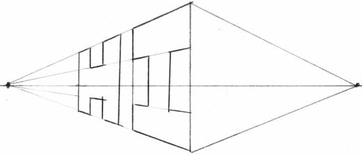 まず、「二点透視図法」の基本の形をつくります。「二点透視図法」とは、絵の中のすべての線が、水平線上に並ぶ2個の「消失点」に集約されるように描く方法です。
