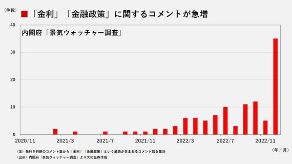 先行き判断のコメント集から「金利」「金融政策」という単語が含まれるコメント数を集計したところ、前月から急増していた。