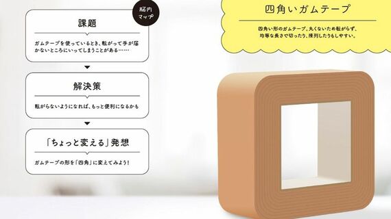 まさにこの「四角いガムテープ」は、それを達成できたアイデアだと思います。形を「丸」から「四角」に変えただけで、「転がってしまう問題」を解消し、「均等な長さで切れる」「陳列しやすい」といった付加価値も生まれました。