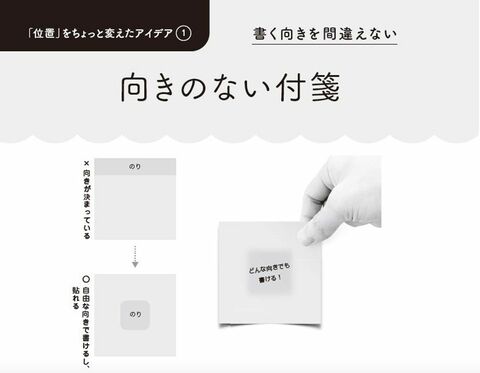 次に紹介する「向きのない付箋」も、「付箋の糊は、なぜ端についているのか?」と、当たり前を疑ったことがきっかけでした。これは付箋の「位置」をちょっと変えたアイデアです。