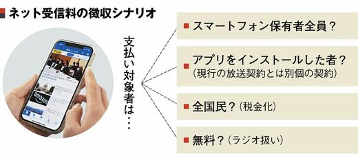 受信料収入が6000億円を割り込むのが時間の問題となる中、NHKはテレビ放送を見ない人からも受信料を徴収できる仕組みを築きたい。ネットが本業化された場合、どのような形で受信料を徴収するのか。NHKは「ネットに接続できるというだけで、スマートフォンやパソコンから受信料を徴収することは現時点では考えていない」とする。