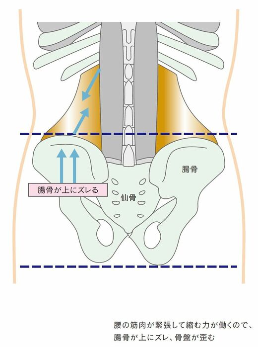骨格にゆがみがあると筋肉に「耐える力」が働き、緊張します。骨盤周辺を例にして解説しましょう。痛みの原因は「筋肉の緊張」とお伝えしましたが、筋肉は緊張すると縮みます。腰部内の筋肉が緊張して縮むと、骨盤の腸骨という骨が、上にズレたりねじれたりします。
