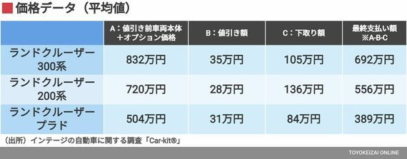 結果は、300系:832万円、200系:720万円、プラド:504万円となっていた。