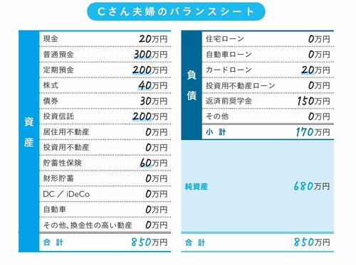 Cさんの世帯年収は、Cさんの500万円と妻の300万円を合わせて800万円になります。この金額が、資産形成を考えるお金のベース。Cさん単独の500万円とはスケールがまったく違います。