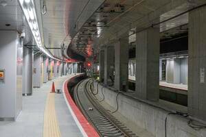報道公開時の移動は地上の公道をたどったが、完成後のうめきたエリアへの通路は地下2階へ下り、道路を横断した先で地下1階へと上がる改札内通路となる。
