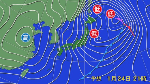 1月24日から25日にかけて、低気圧が日本の東に進み、大陸の高気圧が張り出す見込みです。