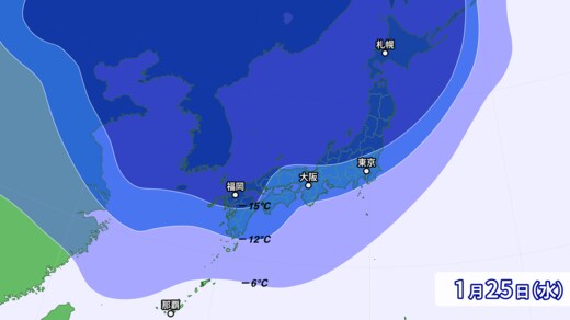 そして、大雪の目安となる-12℃以下が北海道から九州の広い範囲を覆い、さらに強い-15℃以下の寒気が西日本の一部に流れ込む予想となっています。