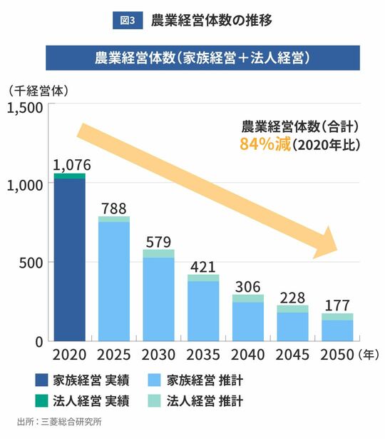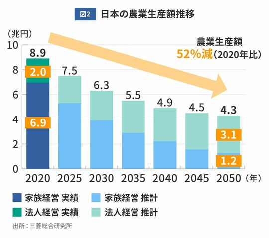 農業生産額の半減に大きく関係するのは、農業経営体数の減少だ。50年の農業経営体数は、20年実績の2割にも満たない水準に落ち込み、経営耕地面積は同50%減の163万ヘクタールとなる見込みである。