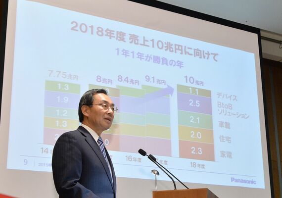 3月26日、2015年度の事業方針説明会を開催したパナソニック。会見の席で津賀一宏社長はその先の目標である、2018年度売上高10兆円達成に向けて、こう攻めの姿勢を見せた。