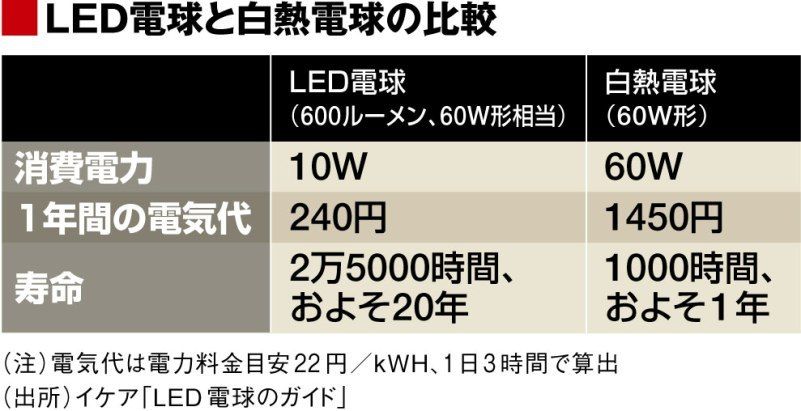 イケアが発行する「LED電球のガイド」では、白熱電球(60W形)と、同等の明るさであるLED電球(600ルーメン)を1日3時間使用する状況(電気代は22円/kWHで計算)で比較している。この場合、白熱電球の消費電力は60W、1年間の電気代は1450円、寿命は1000時間(約1年間)。対して、LED電球は、それぞれ10W、240円、2万5000時間(約20年間)になるという。